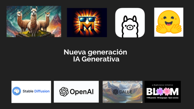 Las inteligencias artificiales generativas no tienen que ver con que yo le dé un dato y me diga qué característica tiene o qué propiedad tiene o me resuelve un problema. Intenta generar nuevos datos que sean parecidos a los datos anteriores. El objetivo de la IA generativa es generar datos nuevos a partir de los patrones que habrá encontrado en los anteriores. Veamos algunas grandes marcas conocidas de este tiempo: