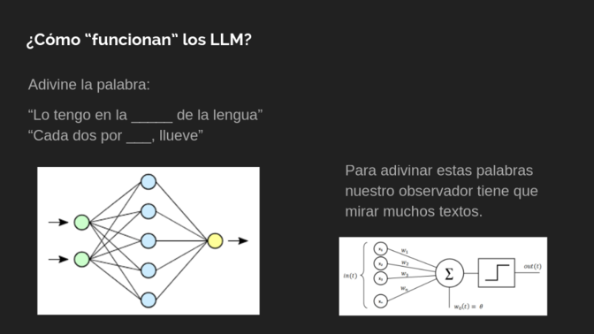 Es importante mencionar que chat GPT y todos los otros modelos de lenguaje grandes son precisamente se llaman LLM, Lash Language Models. El juego que juegan es tratar de adivinar la palabra, la letra que sigue, la instrucción que sigue o todo ese tipo de cosas. ¿Qué pasa si yo digo, «Lo tengo en la mm de la lengua?» Seguramente pondrías «punta» Sería muy raro que alguien piensa otra palabra. Lo que hacen los modelos de lenguaje es analizar grandes cantidades de datos, de información, de texto que están dando vueltas y en cierta forma lo que hacen es sacarle probabilidad. La probabilidad que vaya la palabra punta, por lo menos para lo que yo he escuchado toda mi vida y lo que he leído toda mi vida, es altísima. Y la palabra, por ejemplo, lo tengo en la zángano de la lengua, tendría una probabilidad muy baja nunca en mi vida, creo yo. Agarra y dice, «Puo escribir, lo tengo en la y se fija en una tabla que tiene, no, no es una tabla, pero se hace unos cálculos matemáticos y calcula la probabilidad de cada una de las palabras que siguen. Chat GPT se fija en la probabilidad. Dice, «O las 10 palabras más probables son estas 10.» Y le pone alguna. Entonces, eso responde un poco, me parece interesante, por qué uno cuando escribe algo en chat GPT o en algún otro lado, la misma oración varias veces va generando frases distintas y es un poco por eso, porque en realidad no te da la palabra más probable, porque si te diera la más probable siempre haría la misma oración. En realidad juega, te dice, mira, tengo 10 palabras más probable y tomo, qué sé yo, aleatoriamente alguna de esas 10 para continuar. Para esto lo que tiene que hacer es analizar muchísimos datos.