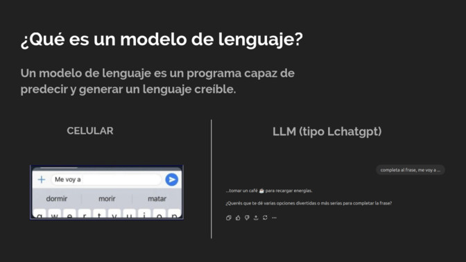 Entonces, cuando yo escribo, por ejemplo, en el celular «me voy a» el celular intenta adivinar cuál es la próxima palabra que voy a poner, que es dormir, morir o matar, por ejemplo.